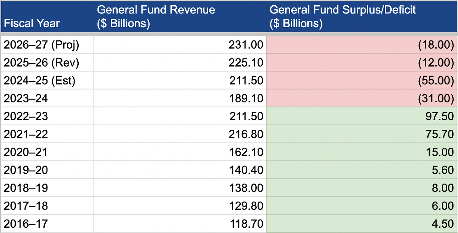 California is going through an economic boom. Tax revenue has basically doubled over the last ten years. However, literally all of it is being spent as it comes in!