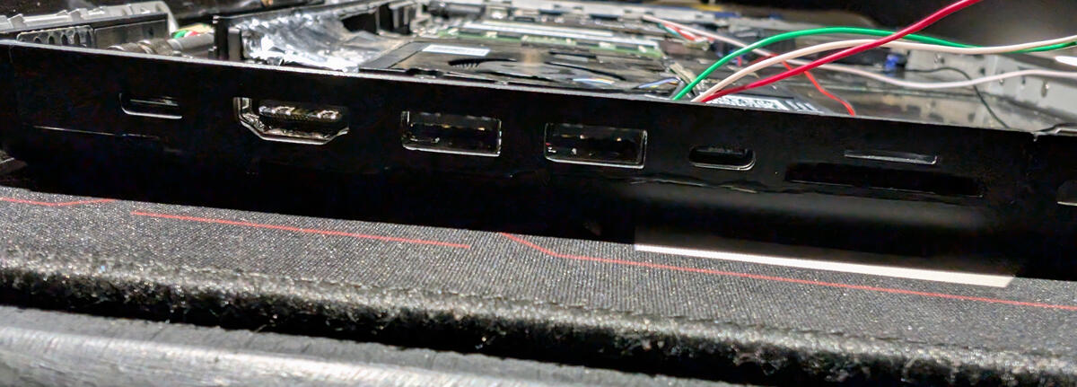 the right side was thankfully much easier than the left, since the old dvd drive's slot was exactly the height of a usb c port. so i order a usb c hub, design a shield to fill in the gaps between the ports, and mounted it will some standoffs.better yet, this side has a mounting piece that not only holds down the ports and prevents from lifting up, it also clips the top case down.