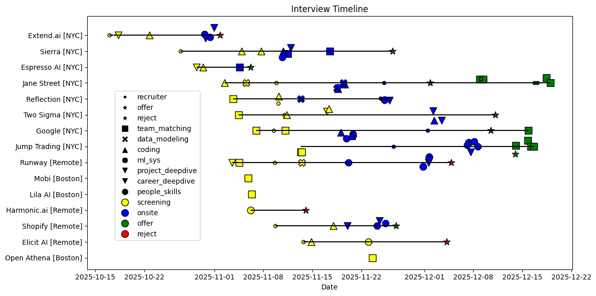 I started casually asking around mid-October, and in early November I made the decision to switch full time to job-hunting. Interviewing really kicked into high gear during November; during the 3.5 weeks leading up to Thanksgiving, I averaged 4 interviews a day. I’d been somewhat afraid that my coding muscles had atrophied after 6 months of Claude Code, but it all came back quite quickly at this pace of interviewing. Offers rolled in starting around Thanksgiving, with the last offer coming in mid-December.