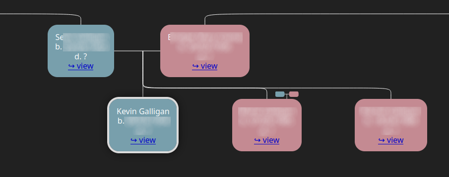 Most recently, I added my own graphical tree browser to the website, using the family-chart JavaScript package. I had to learn how to use webpack for deploying JS scripts with their dependencies - weird that I'd never had to do that before, given that it's a massive part of the development process for a lot of programmers. Anyway, once I got over that, I spent hours fiddling with the code and digging into the family-chart docs & repo until I had it looking more or less how I wanted. The resulting script might be useful for anyone else attempting the same thing; see also the tree.html template.