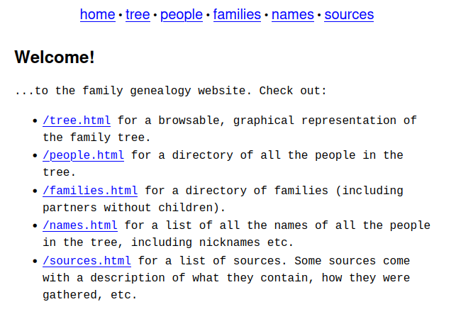 With the tree data in hand, the genegenie script starts up a Flask server. When the user then opens a page on the website in a web browser, like /person/<gramps_id>.html, the server renders the person.html jinja2 template, using the Gramps data to fill in the blanks. I've added a flag to the script's CLI that makes it call FrozenFlask, so that the entire website can be dumped to a folder.