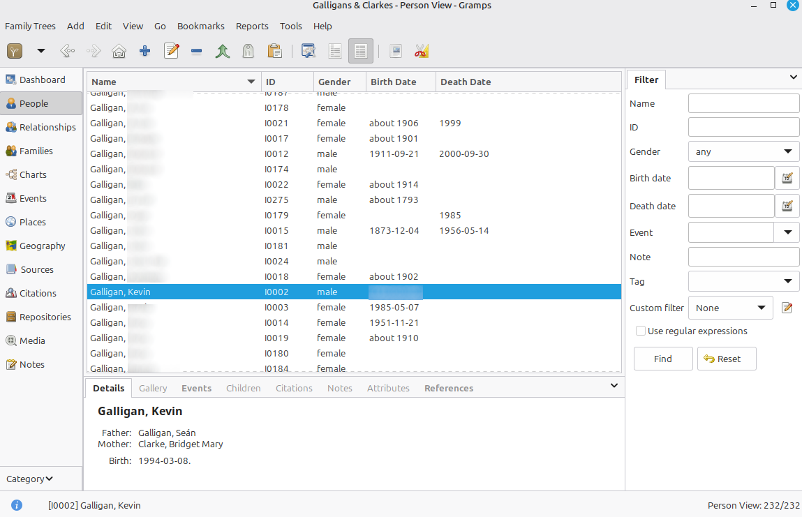 Repeat this tedious process dozens of times, and the result is a full family tree that includes all your relatives and their relationship to each other. Gramps provides various tools to visualise and browse the tree.