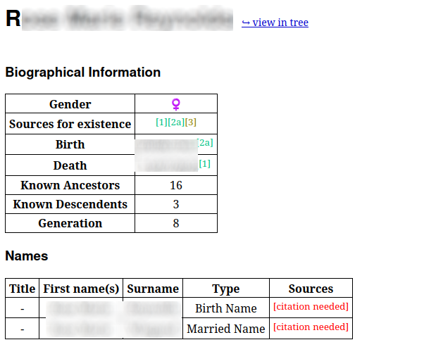 Something I wanted to do with my tree was to capture biographical information about my ancestors: professions, stories, quotes, and whatnot. To achieve this, I create a "Description" attribute under the person in question. I then attach a note to that attribute, containing freeform text. On the website generation side, I treat the text as raw HTML (that'd be a bad idea if I weren't in control of the data; someone could, for example, inject a cryptomining script through the description). I also add citations to each description attribute so I know where they come from.