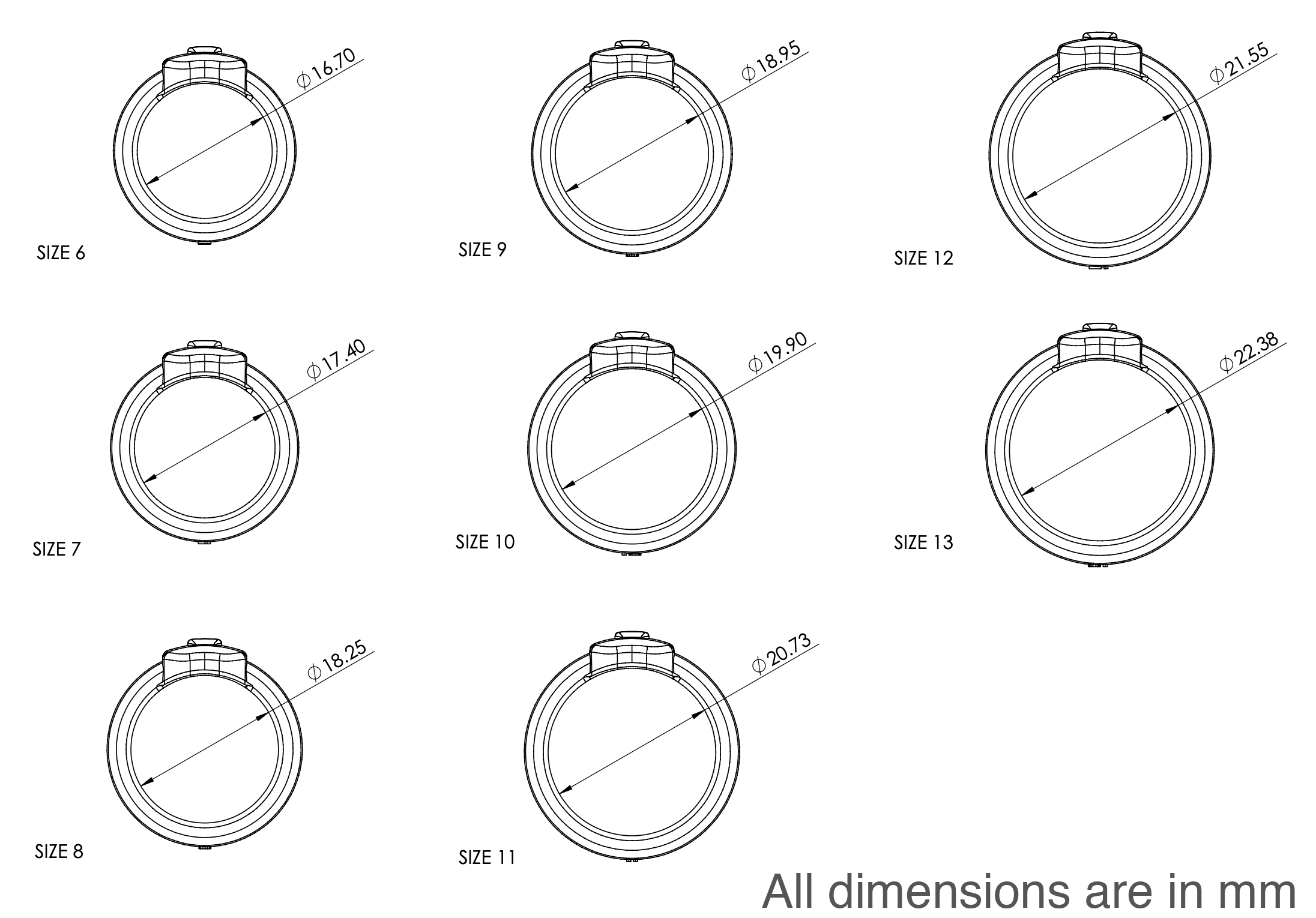 You’ll be able to pick your ring size and color after placing a pre-order. If you have a 3D printer, you can print our CAD designs to try on. We’re also planning a sizing kit. You can view the measurements of the inner diameter of each ring size.