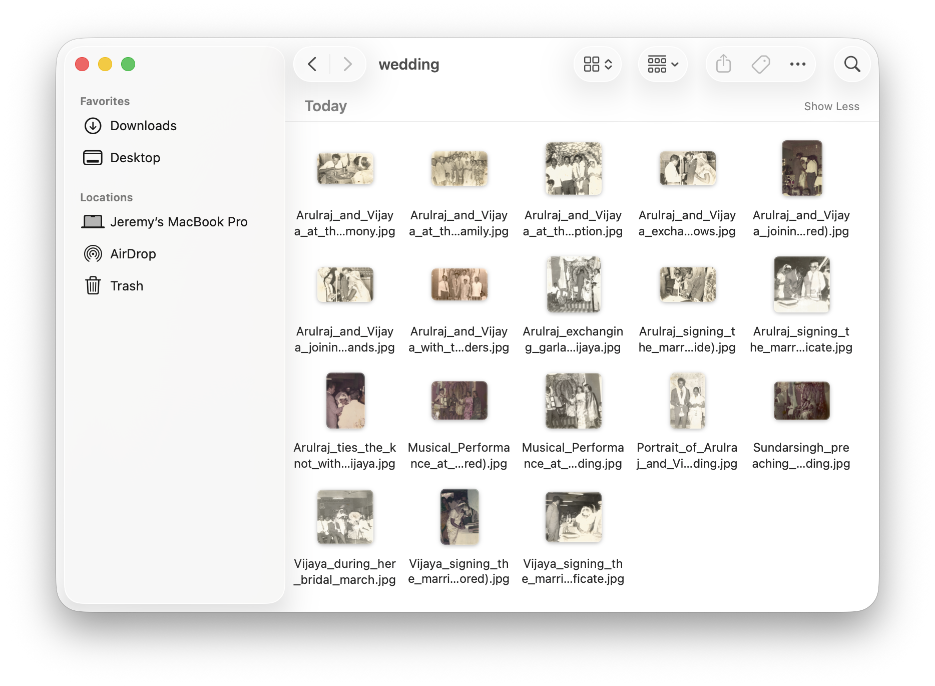 As I got done with grouping all of them, I was able to see flashes of stories in my head, but they were ephemeral and fragile. For instance, there was a group of photos that looked like it was taken during my grandparents' wedding but I didn't know the chronological order they were taken because EXIF metadata didn't exist around that time.