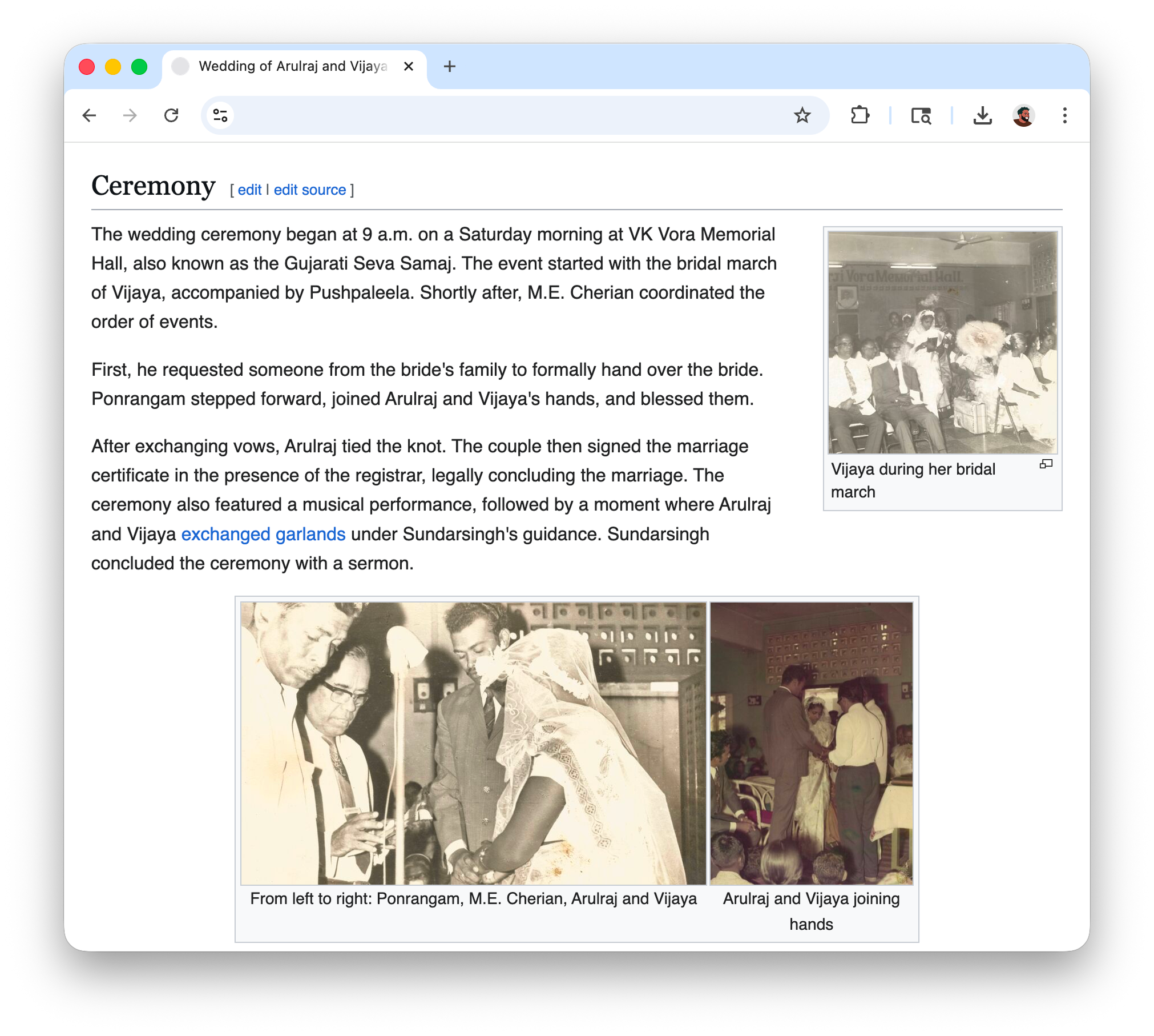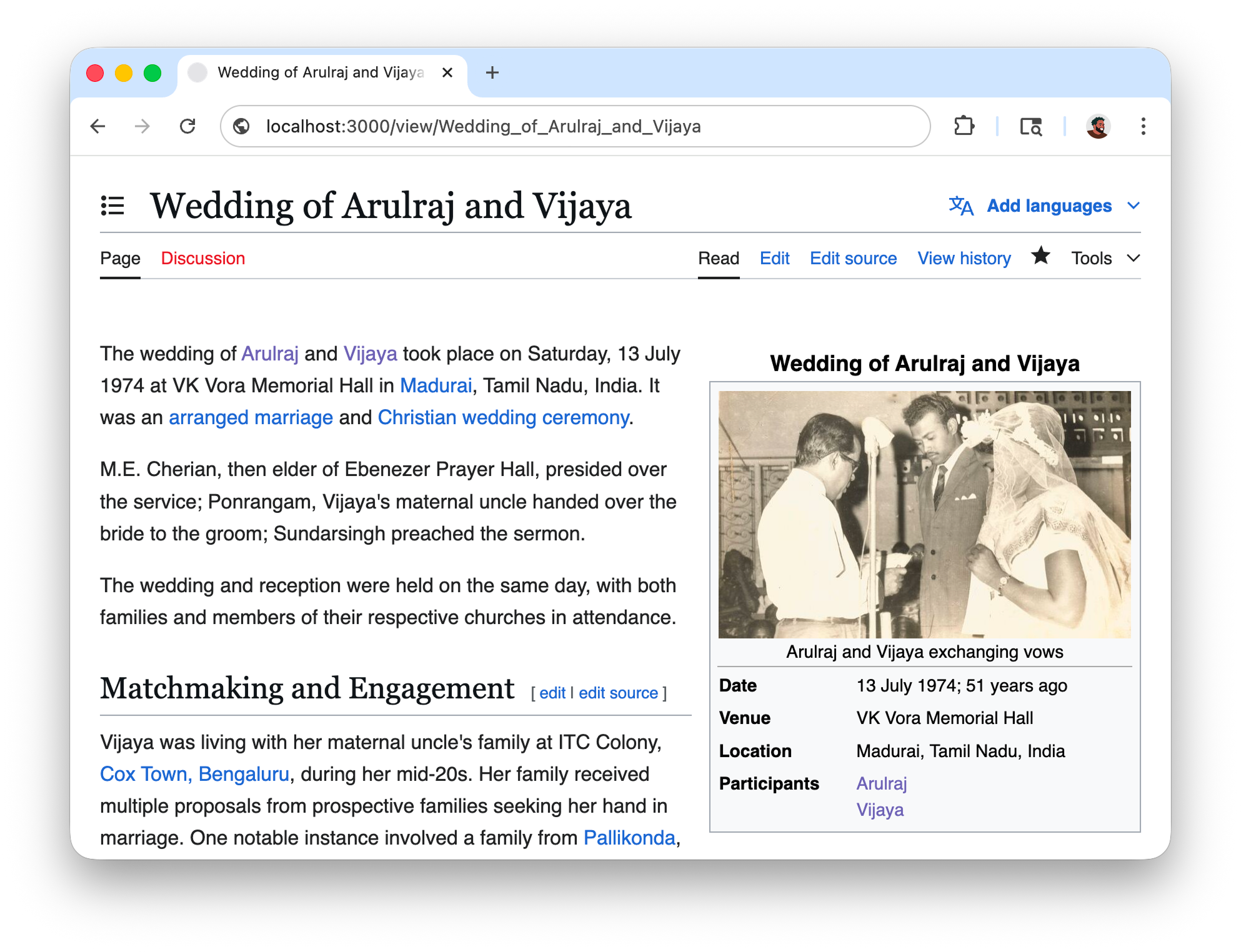 After the "interview", I had multiple pages of notes connecting the photos to events that happened 50 years ago. Since the account was historical, as an inside joke I wanted to see if I could clean it up and present it as a page on Wikipedia so I could print it and give it to her. So I cloned MediaWiki, spun up a local instance, and began my editorial work. I used the 2011 Royal Wedding as reference and drafted a page starting with the classic infobox and the lead paragraph.
