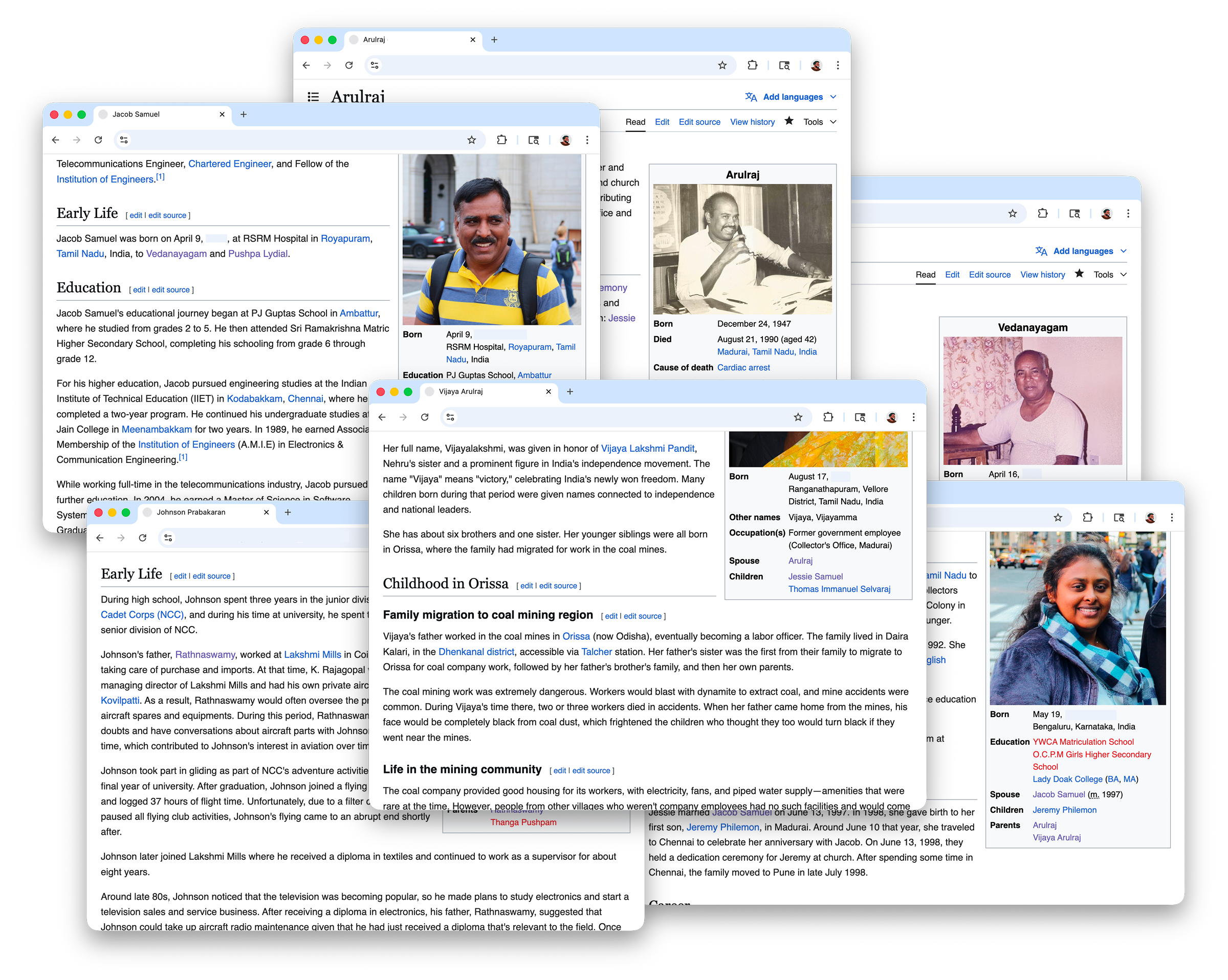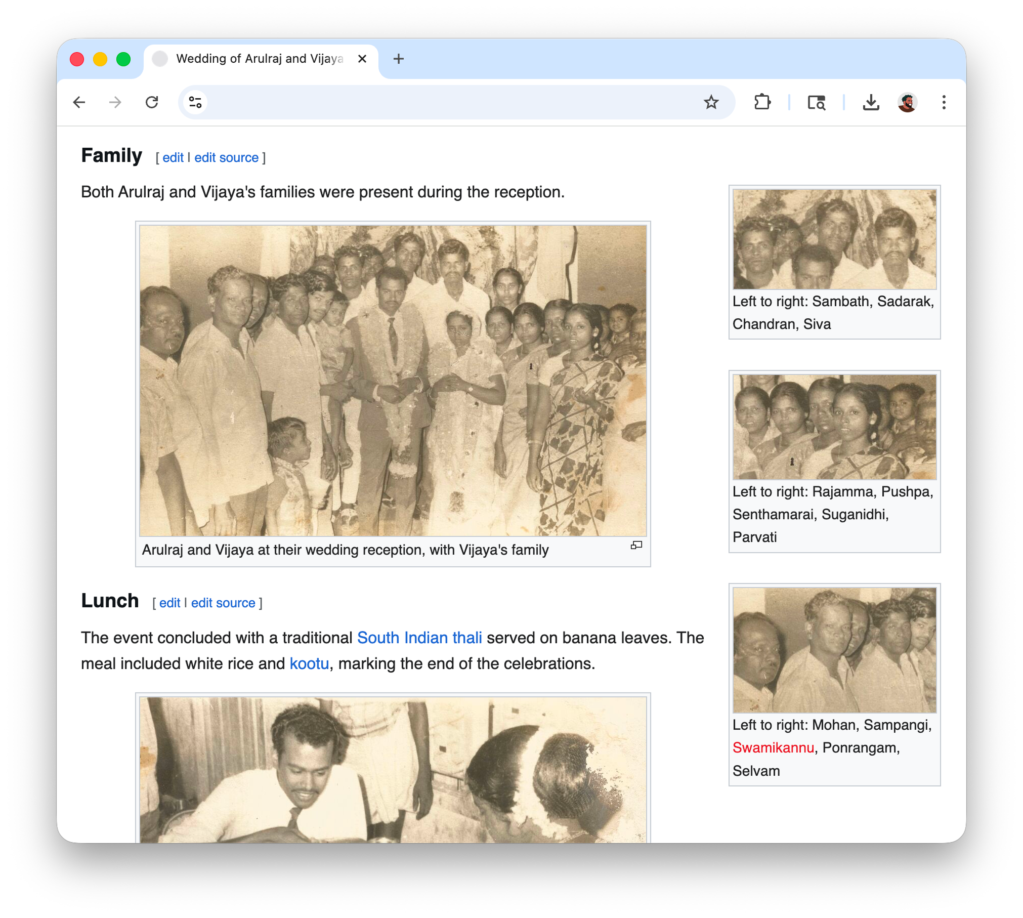 Over time, I managed to write a lot of pages connecting people to different life events. The encyclopedia format made it easy to connect dots I would have never found on my own, like discovering that one of the singers at my grandparents' wedding was the same nurse who helped deliver me.