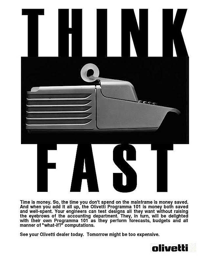 The total initial production run of the Programma 101 was 44,000 units. The public unveiling of this “calculator” was at the World’s Fair in New York City during the Fair’s second season in 1965. The intended star of Olivetti’s showing was the Logos 27, another of their mechanical calculators. The P101 was in a small backroom, and Olivetti’s management hadn’t really thought it’d receive much attention. The presenter of the P101 informed the audience that he’d be calculating the orbit of a satellite, put the card in the machine, and after a few seconds the computer began printing the result. There was quite a bit of excitement. The P101 was moved to the front of the booth. Fair attendees assumed that there must be hidden wires connecting it to a mainframe offsite, and thus the Olivetti representatives began allowing people a closer look. Following the fair, Olivetti sold 40,000 units in the USA alone. Some of these went to NASA where the humble little machines were used for Apollo 11, as David W. Whittle recalls:
