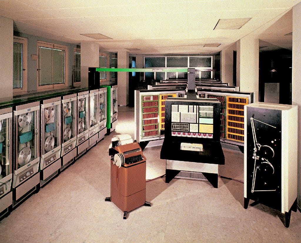 Upon completion of the 9002, Tchou gathered his senior researchers and told them that this machine simply wouldn’t do. Olivetti would launch a fully transistorized mainframe computer. For this, the company allied itself with Fairchild, and launched its own transistor company, Società Generale Semiconduttori, in 1957. The two companies then codeveloped the planar process for integrated circuit manufacturing. The prototype transistorized ELEA was completed in late 1958. This became the ELEA 9003 which was presented to the President of the Republic Giovanni Gronchi on the 8th of November in 1959. This machine weighed in at about five tons, and it could run 8000 to 10,000 instructions per second. It was built with transistor-diode logic and core memory. The ELEA 9003 wasn’t built with the concept of words (not really anyway). Each memory location could hold a single alphanumeric character with an instruction being eight characters long. The base memory was thus 20,000 memory locations and could be extended to 160,000 or 20K 8bit instructions or about 26,666 6bit characters. With a cycle time of about 10 microseconds, the computer’s speed was approximately 100KHz. Uptime wasn’t great, just shy of 50% per day, typically being available only between the latter part of each morning to the early part of the evening. This improved over time. The 9003 was capable of limited multitasking with three processes being able to be run simultaneously. At the time of introduction, those programs could be written only in machine language. The machine had no dynamic memory allocation so each program was loaded contiguously and always at the same memory location. By convention, the first 3,000 characters were left available for testing programs. Over time, Olivetti made an assembler, Psico, available along with testing software, a monitor program, and tape handling software. For I/O, the 9003 offered card reader/punch, tape, printer, and of course, an Olivetti typewriter.