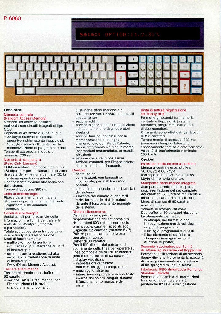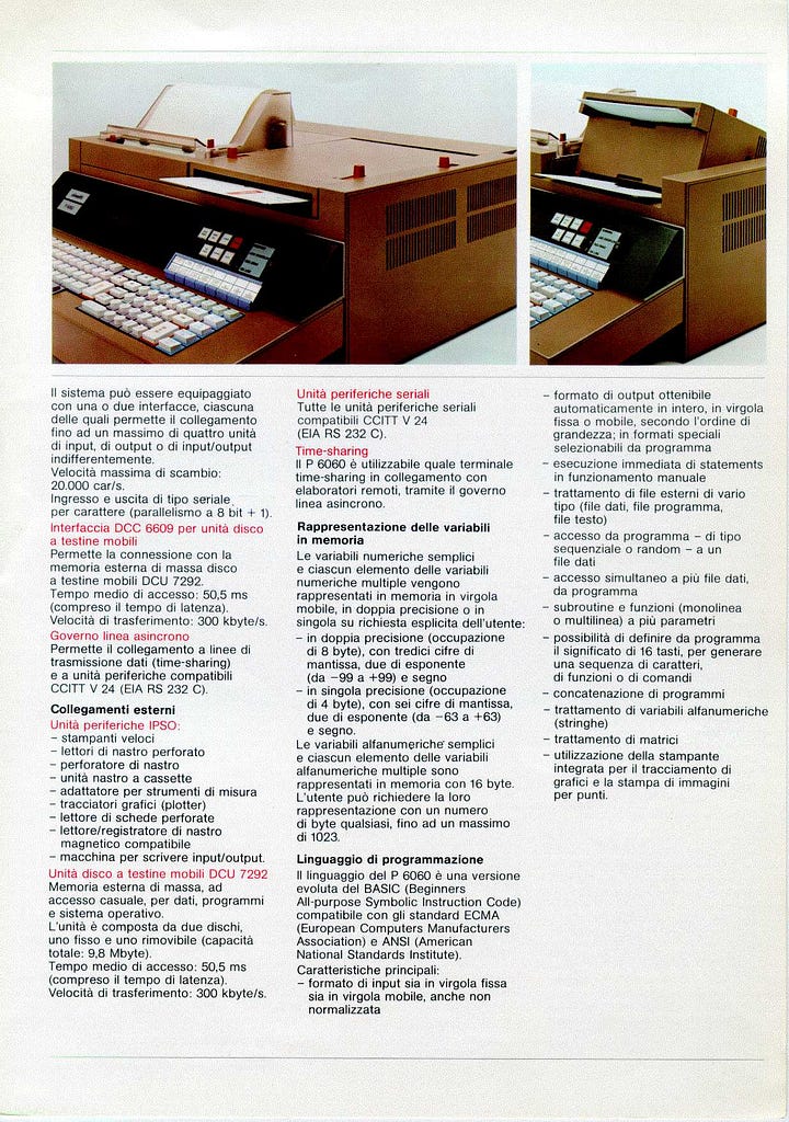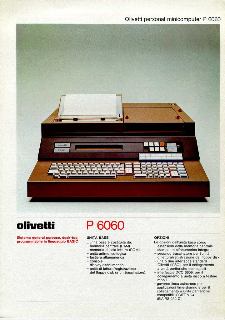Olivetti released the TC 800 terminal in 1974. This used a two-card Olivetti designed processor and ran the Cosmos operating system. It was followed by the TC 1800 in 1977. Perotto didn’t really seem to want to make terminals, so the same CPU and other internals made their way into the P6060 in 1975. The first and most obvious difference is the keyboard, which is finally a full QWERTY keyboard with a 10-key and some extra keys for specific functions. RAM is 48K with 16K available to the user and an access time of 700ns. The ROM loader is made of bipolar LSI circuits and once loaded into RAM occupies the other 32K. Total RAM could be expanded to allow up to 48K of user-available RAM. The printer is now larger, and the system included a plasma display capable of displaying a single line of 32 characters (upper and lower case characters as well as symbols). That line on the screen could be “scrolled” up and down over a buffer of 80 characters. IPSO peripheral compatibility was maintained, but the P6060 included two eight inch floppy disk drives of 256K, and RS242 and IEEE-488 connectors. One additional accessory was a VDU for use with CRT displays. Software was significantly different as this machine shipped with BASIC, and the printer supported all characters and graphics supported by the system itself as well as framing, scaling, offsetting, axis drawing, and labeling. With these two advantages, the P6060 would have been of great use to anyone needing to create reports or other office documents.