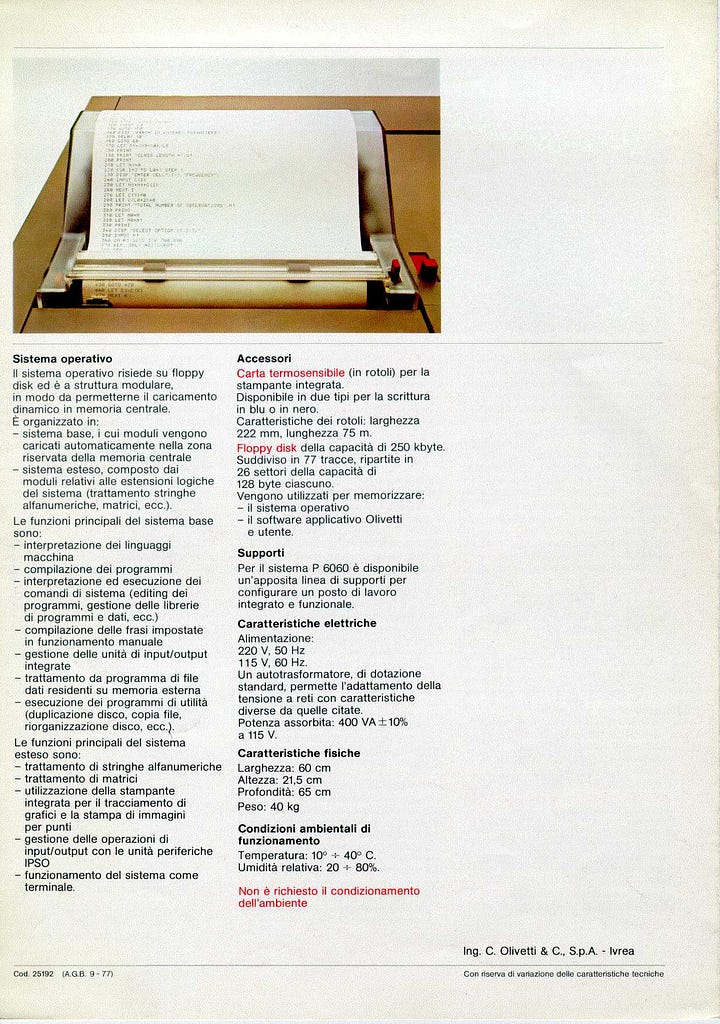 By 1960, the research group had moved to Milan, and Federico Faggin joined the company in autumn of that year. He was tasked with designing a small, inexpensive, personal computer. This machine used 1000 logic gates made out of germanium transistors, and it used 200 PCBs. I/O was done with a teletype. The computer was completed in 1961.