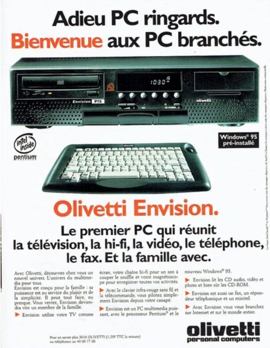 With the arrival of the CD-ROM, the Pentium, great sound, and high resolution displays, the PC was becoming a multimedia powerhouse. Olivetti saw an opportunity to conquer the living room as they’d once conquered the office. The company sought to create a computing appliance that would deliver audio, video, fax, and a telephone answering machine to the buyer. The product was the Olivetti Envision released in 1995. There were two models with either a 486DX4 at 100MHz or a Pentium at 75MHz. Both were equipped with 8MB of RAM, a Trident TGV9470 with 1MB of video RAM capable of 1024 by 768 with 256 colors, a Crystal CS4231 audio controller paired and an Oak Mozart OTI 605 (Adlib compatible but with an IDE CD-ROM controller), a 1.4MB 3.5 inch FDD, 635MB HDD, CD-ROM, an infrared remote, and an 83key keyboard with an integrated trackball operating over infrared. For external connectors, the Envision featured two SCART ports, audio out, MIDI, VGA out, serial, parallel, and RJ11. Internally, the machine had three expansion slots, and a satellite TV decoder card was available. The Envision could operate in three distinct modes. The first was as a true entertainment device with the remote where a user could control volume, play audio or video CDs, and view photos stored on CDs. The second was with the keyboard where the user navigated the Olipilot shell over Windows 95. The third mode was as a standard Windows PC. The Envision was largely a failure. It was expensive (especially with a Pentium), and it had quite a few bugs.