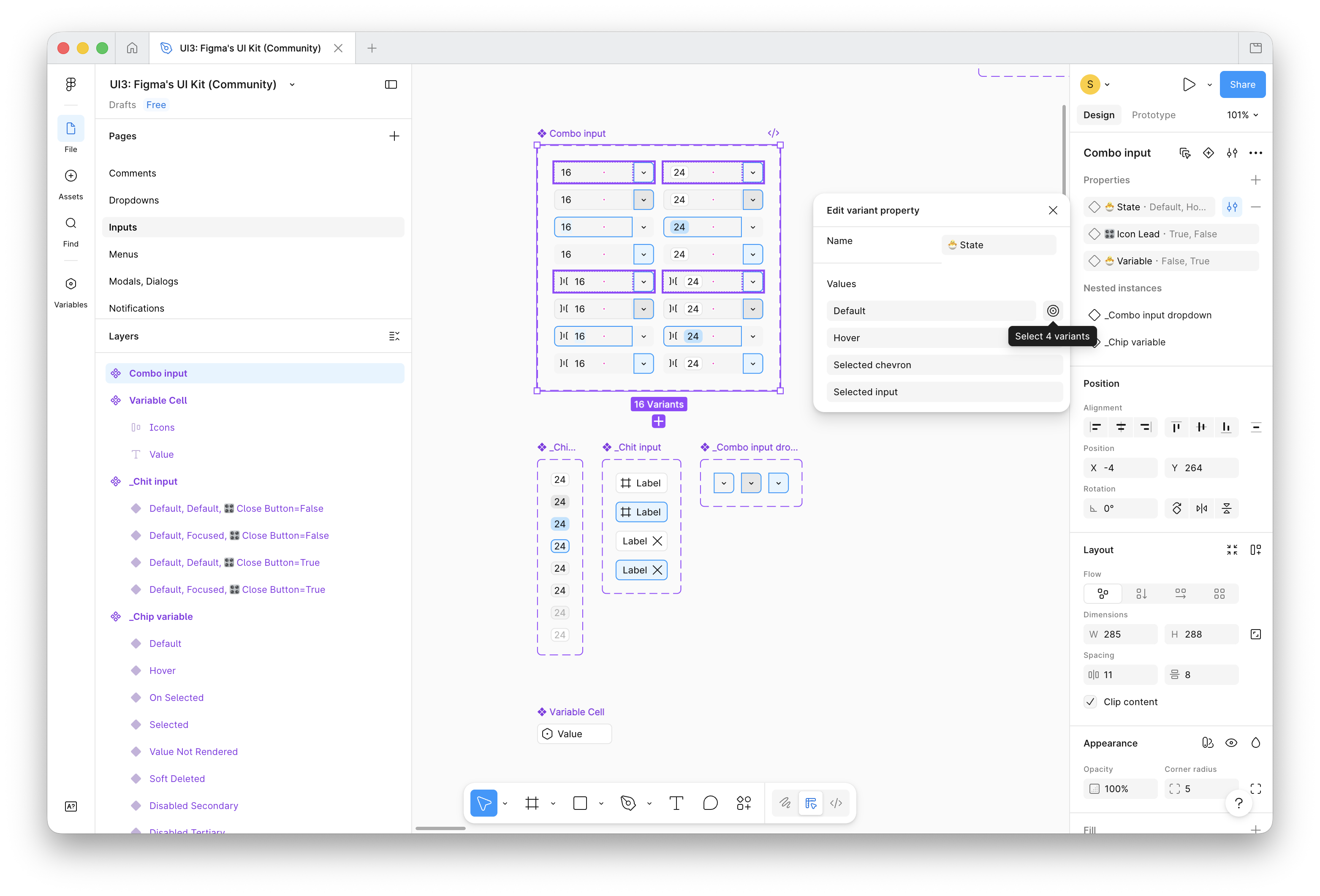 A combo input component with 16 variants. Its children in the layers panel are named things like "Default, Default, Close Button=False" and "Default, Focused, Close Button=True"