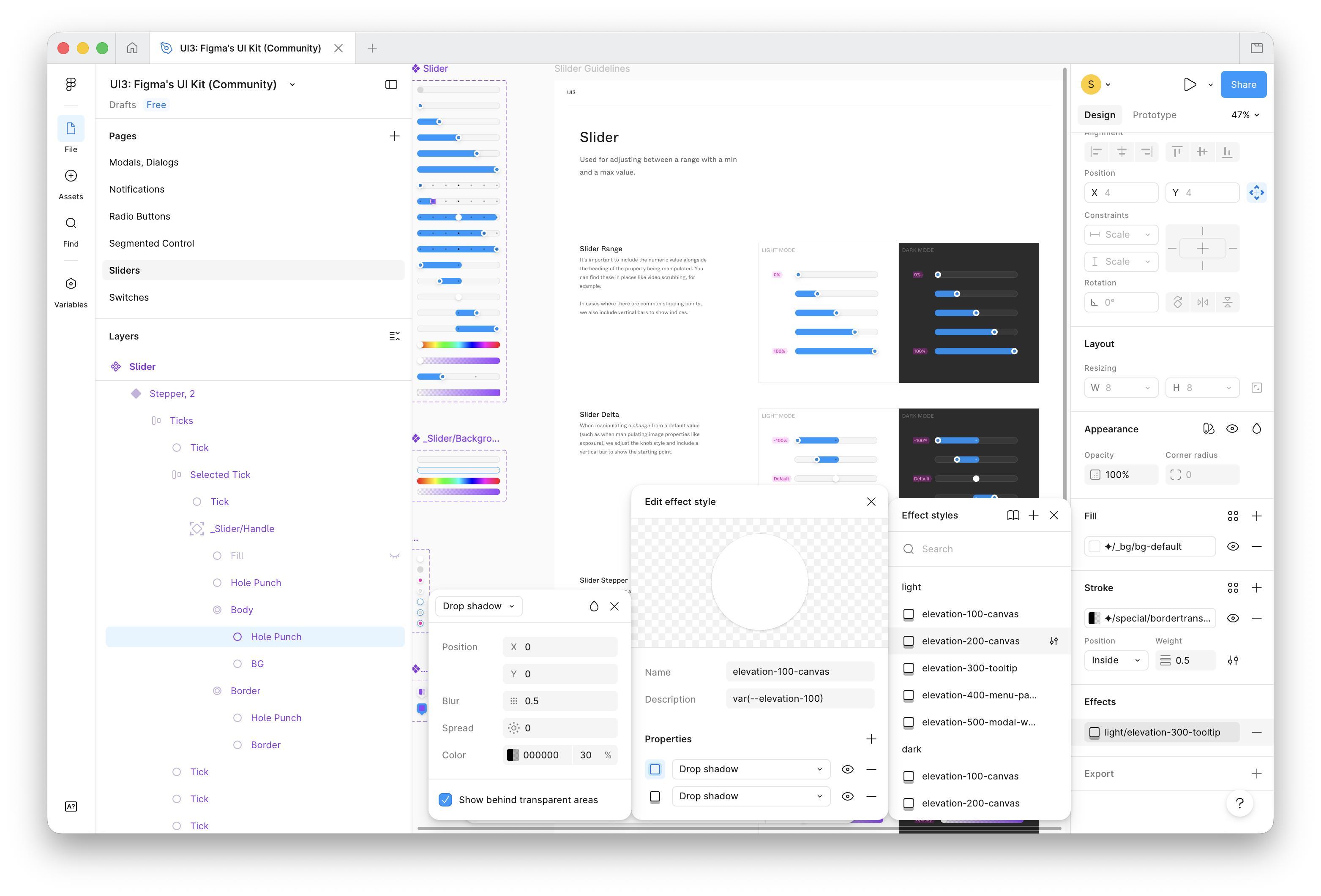 The effect styles panel for a slider component, showing a style named "light/elevation-300-tooltip." Expanding it reveals its entire definition: a 0.5px drop shadow at 30% black. It has its own named style because that’s the only way to document what CSS variable it corresponds to.
