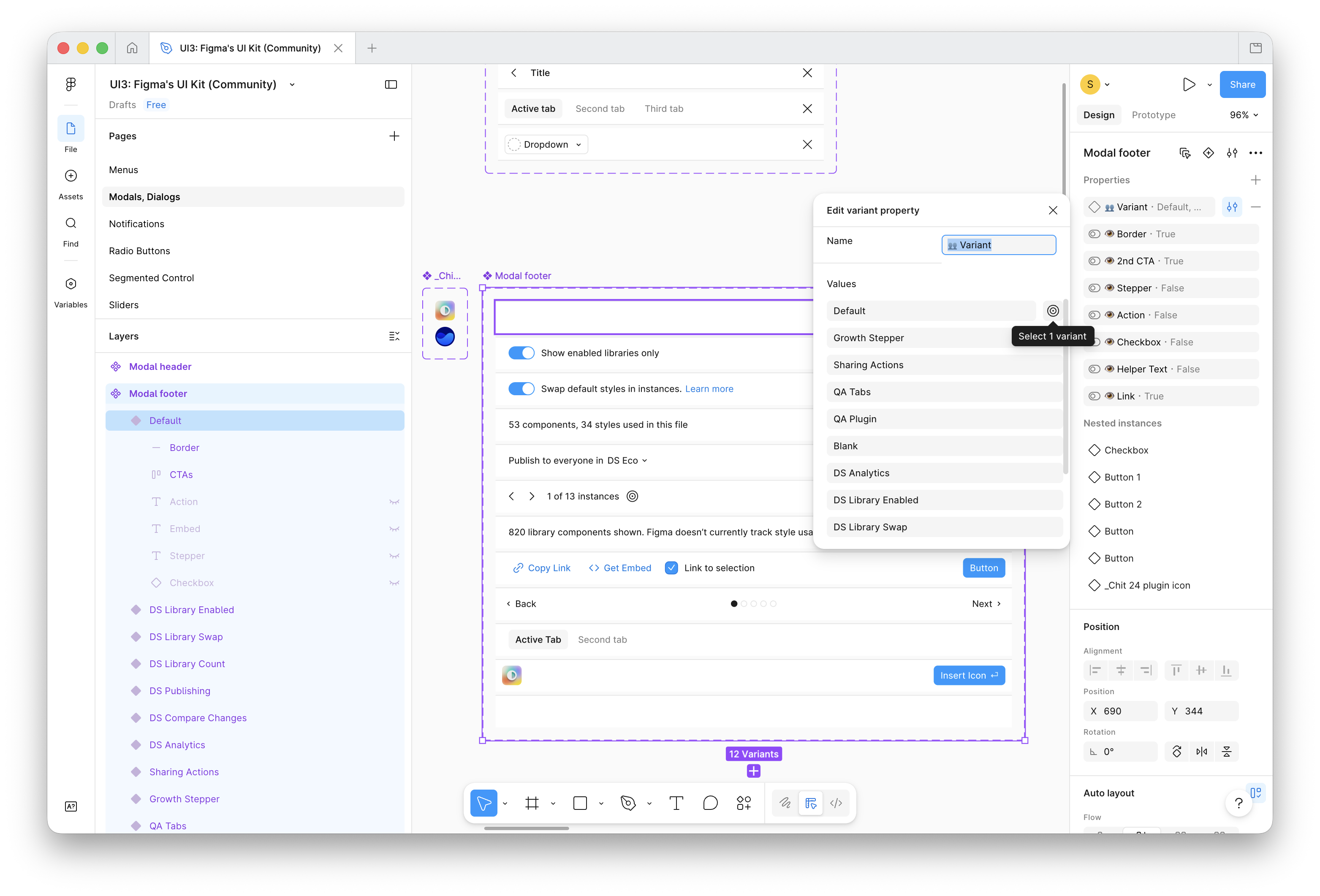A modal footer component open to its variant property editor, showing 12 variants with a dropdown full of values like "DS Library Swap," "QA Plugin," "Growth Stepper," and "Sharing Actions." The right panel lists eight props like "Border," "Second CTA," and "Helper Text"