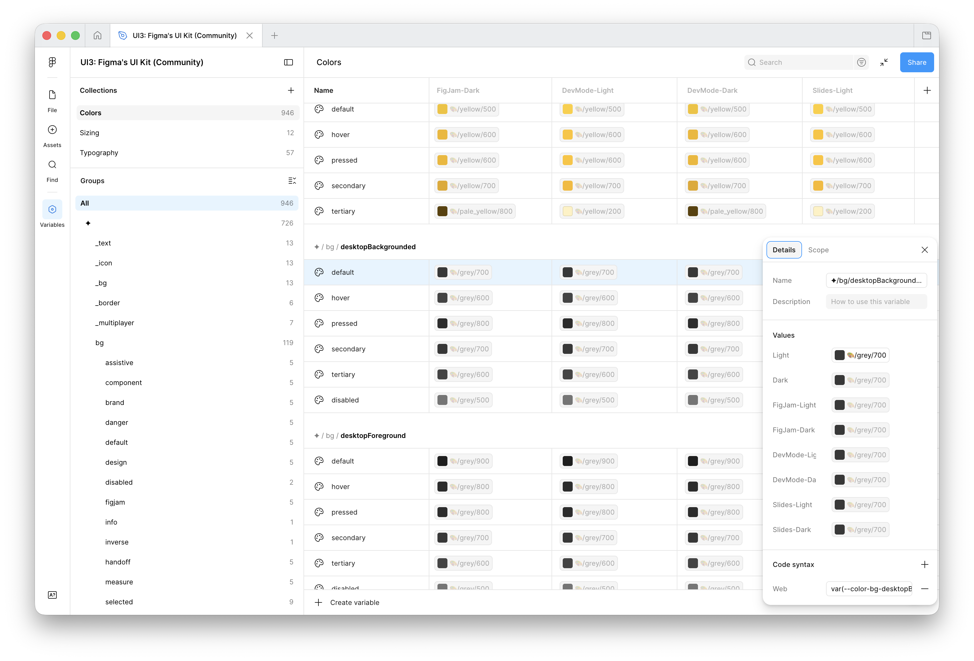 The Figma variables panel showing 946 color variables organized into nested groups like "bg/desktopBackgrounded," with a single selected variable revealing eight mode-specific values: Light, Dark, FigJam-Light, FigJam-Dark, DevMode-Light, DevMode-Dark, Slides-Light, and Slides-Dark.