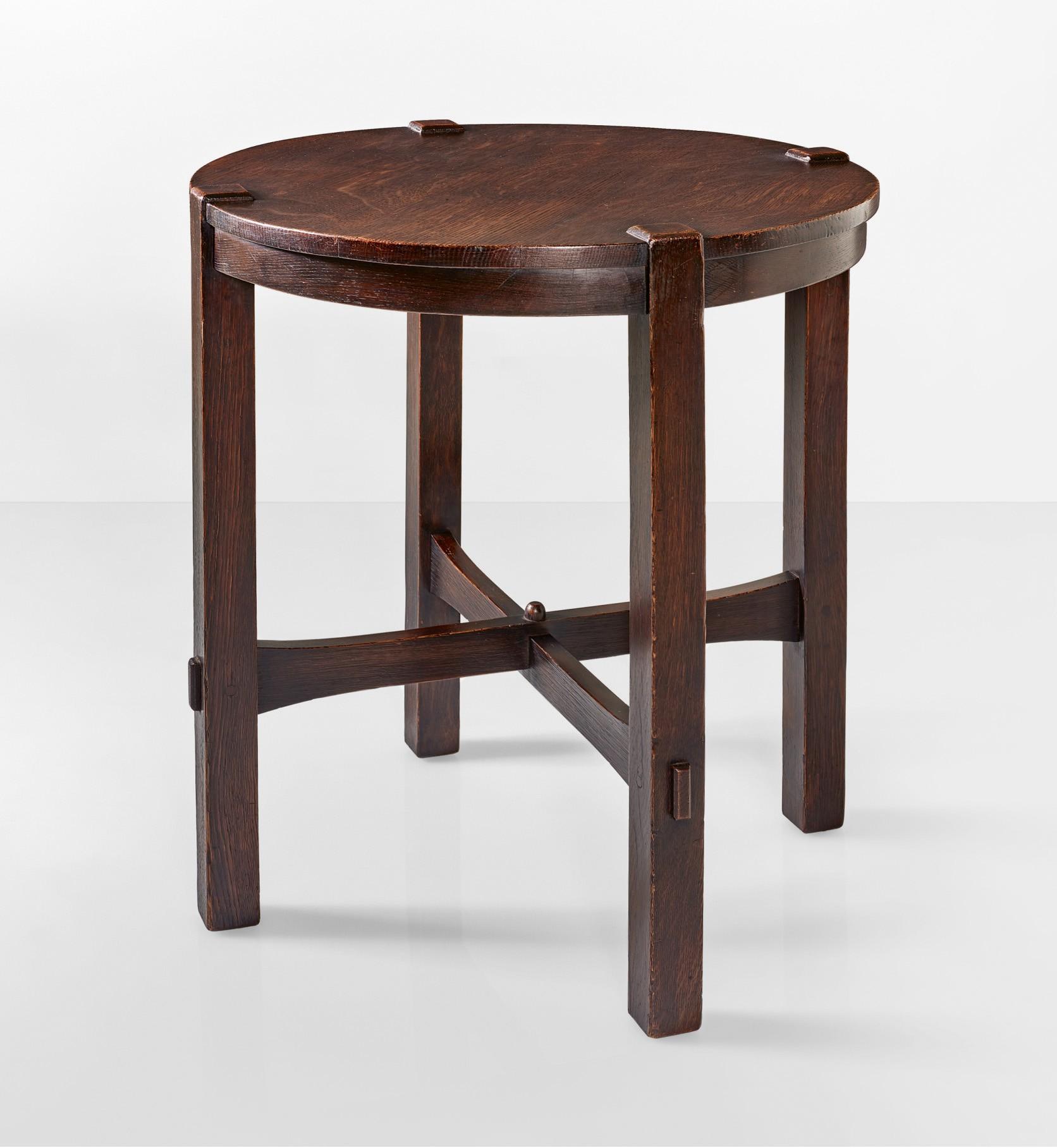 A Gustav Stickley lamp table, circa 1902. The joinery is exposed, not hidden. The wood is the wood.