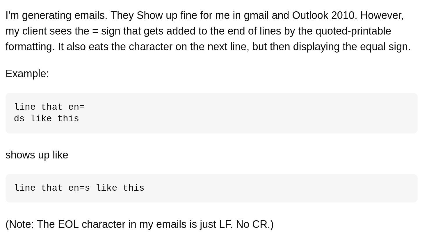 Which leads me to assume that they reused an algo that was usually run in an SMTP server context to do the line unfolding — in that context, you can safely assume that the line ending is a CRLF. And by chance, this algo also works fine if you’re working with a Windows-based file, but fails for a Unix-based file.)