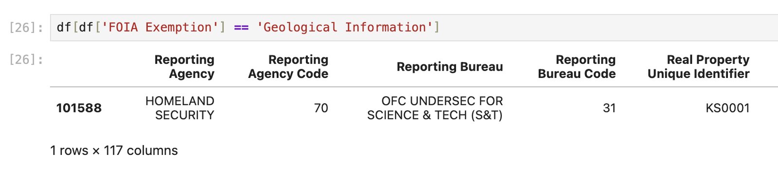 One of the columns in the FRPP dataset is “FOIA Exemption”. There is just one property in the dataset with an exemption of “Geological Information”. Under the Department of Homeland Security. I wonder what its deal is.