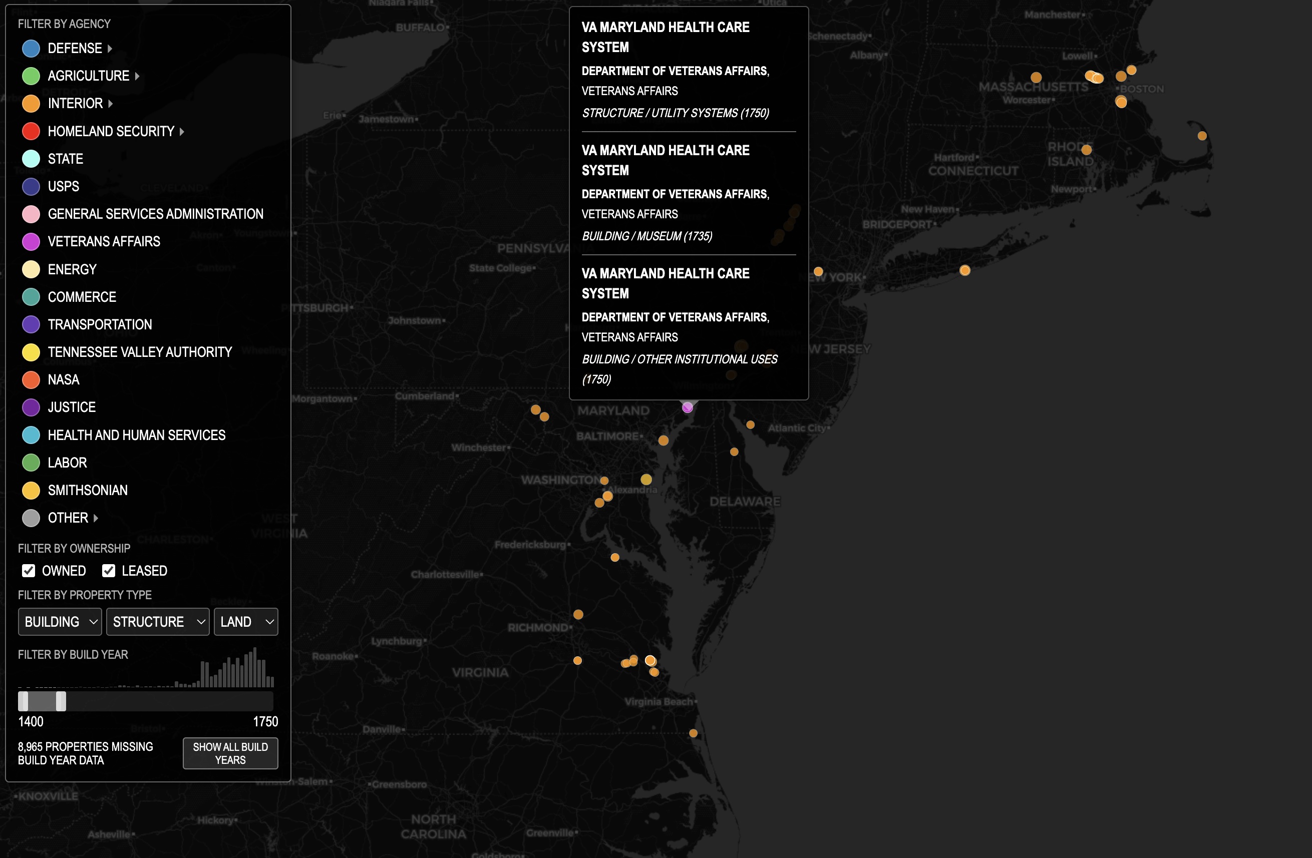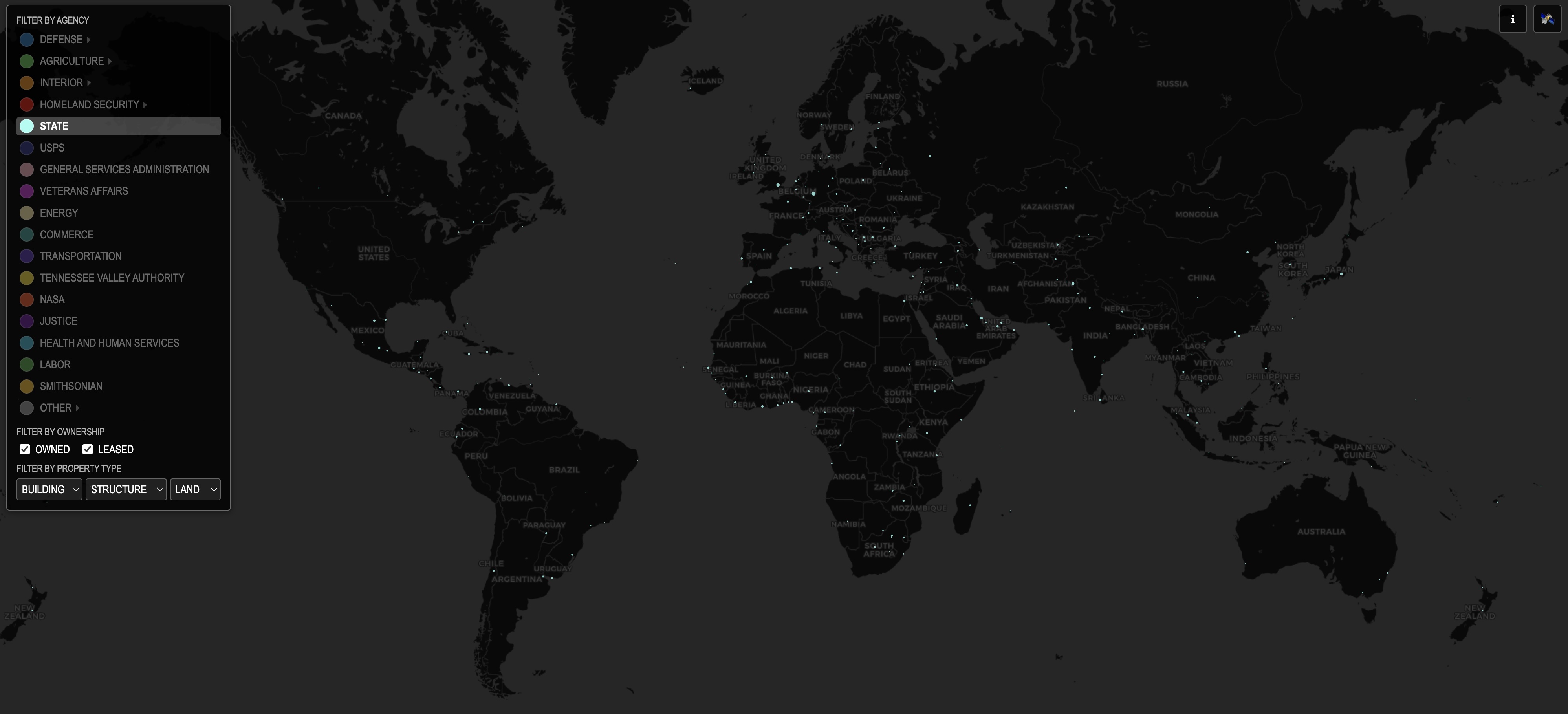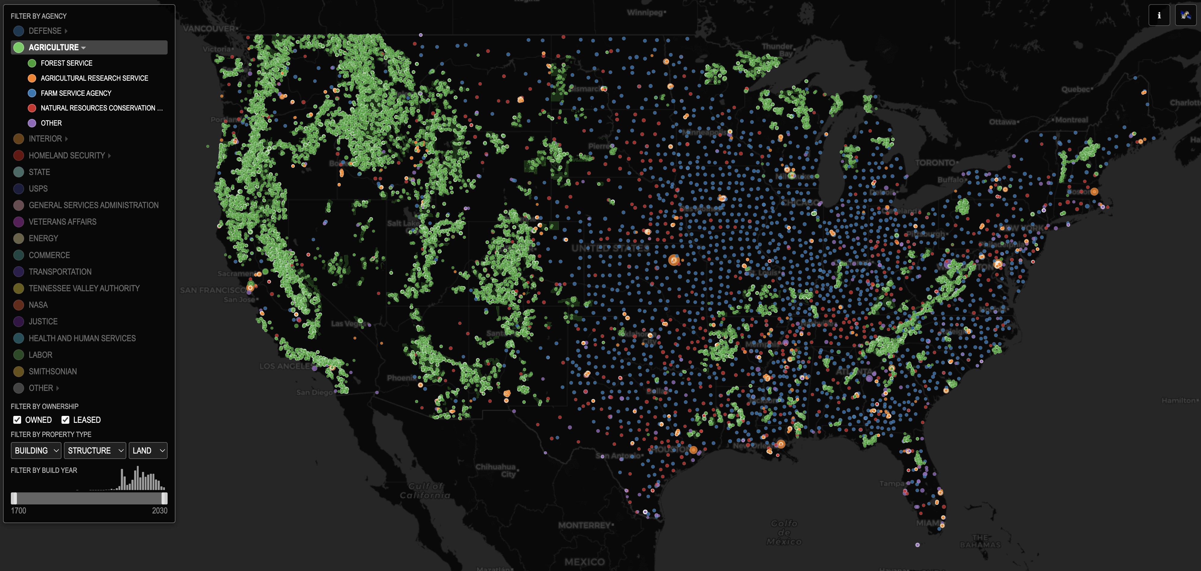 Data is from Federal Real Property Profile data, National Map data and USPS FOIA data. The quality of geocoding varies in these public datasets, please assume locations are approximate. Some of the locations did not contain geolocation info, or were geolocated to Null Island. For these I used the Mapbox geocoder with the data available, which was often only to a city/town name.