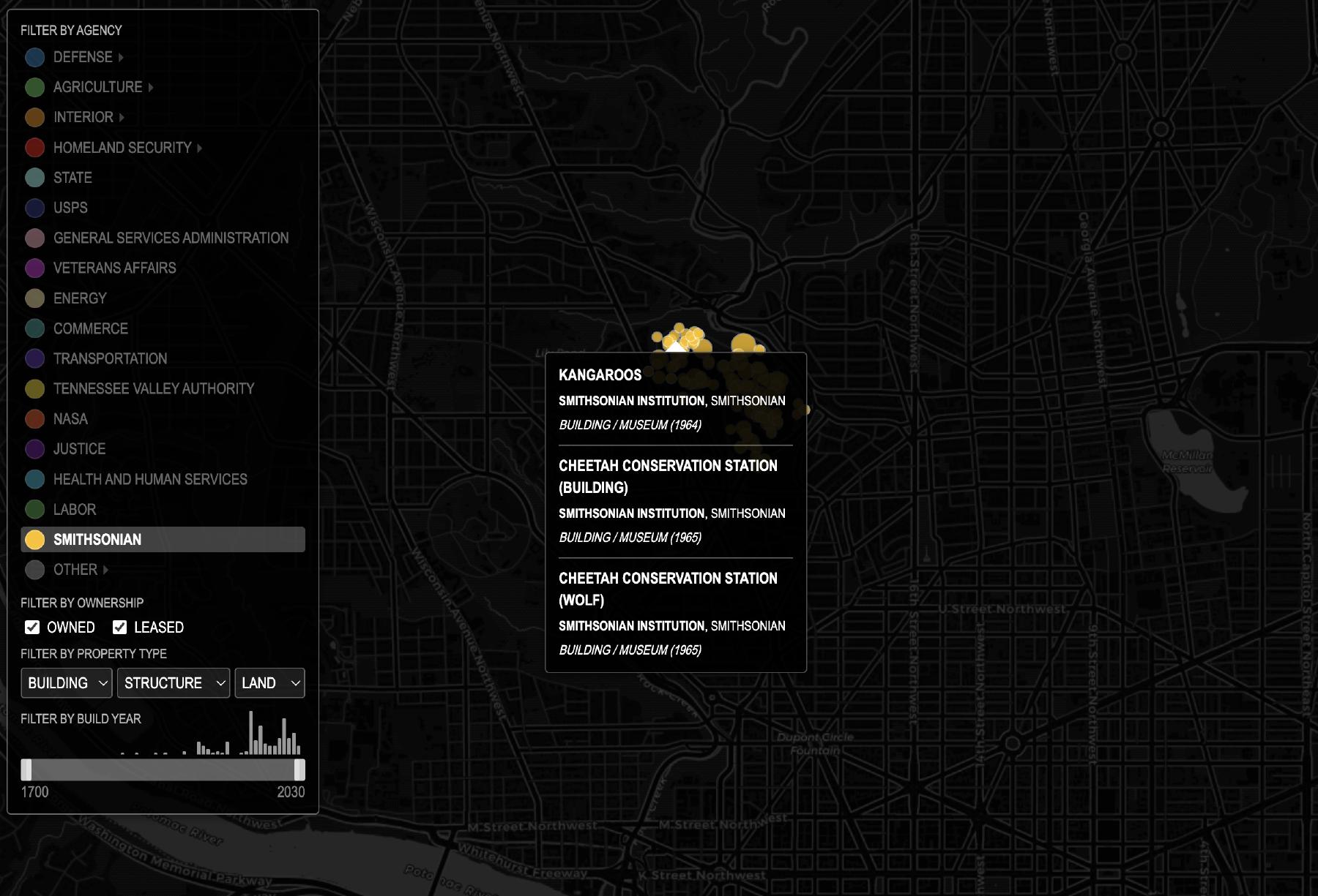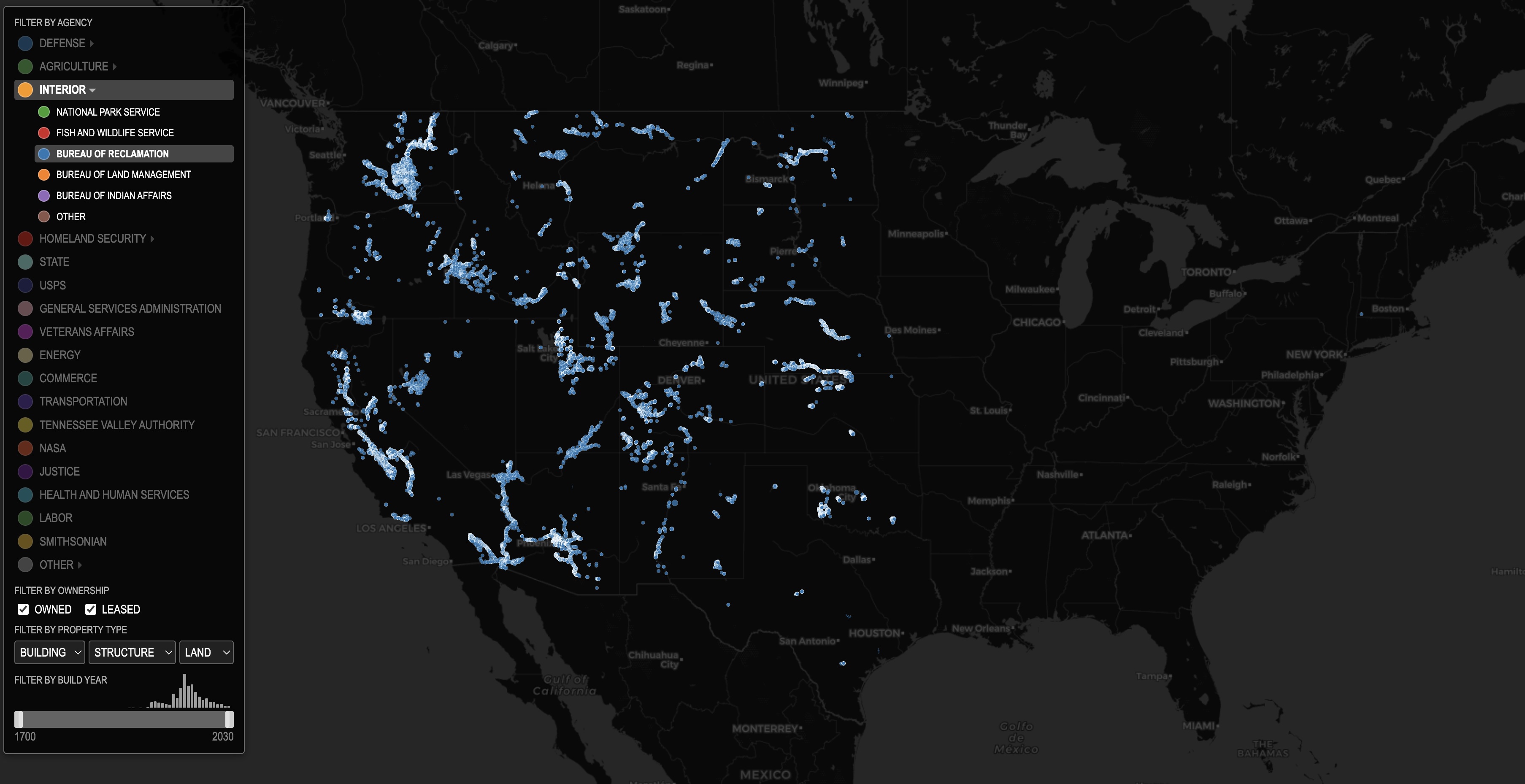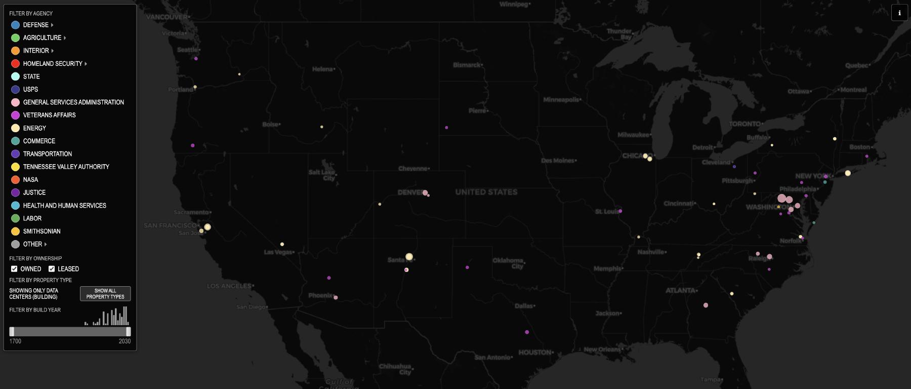 Data is from Federal Real Property Profile data, National Map data and USPS FOIA data. The quality of geocoding varies in these public datasets, please assume locations are approximate. Some of the locations did not contain geolocation info, or were geolocated to Null Island. For these I used the Mapbox geocoder with the data available, which was often only to a city/town name.